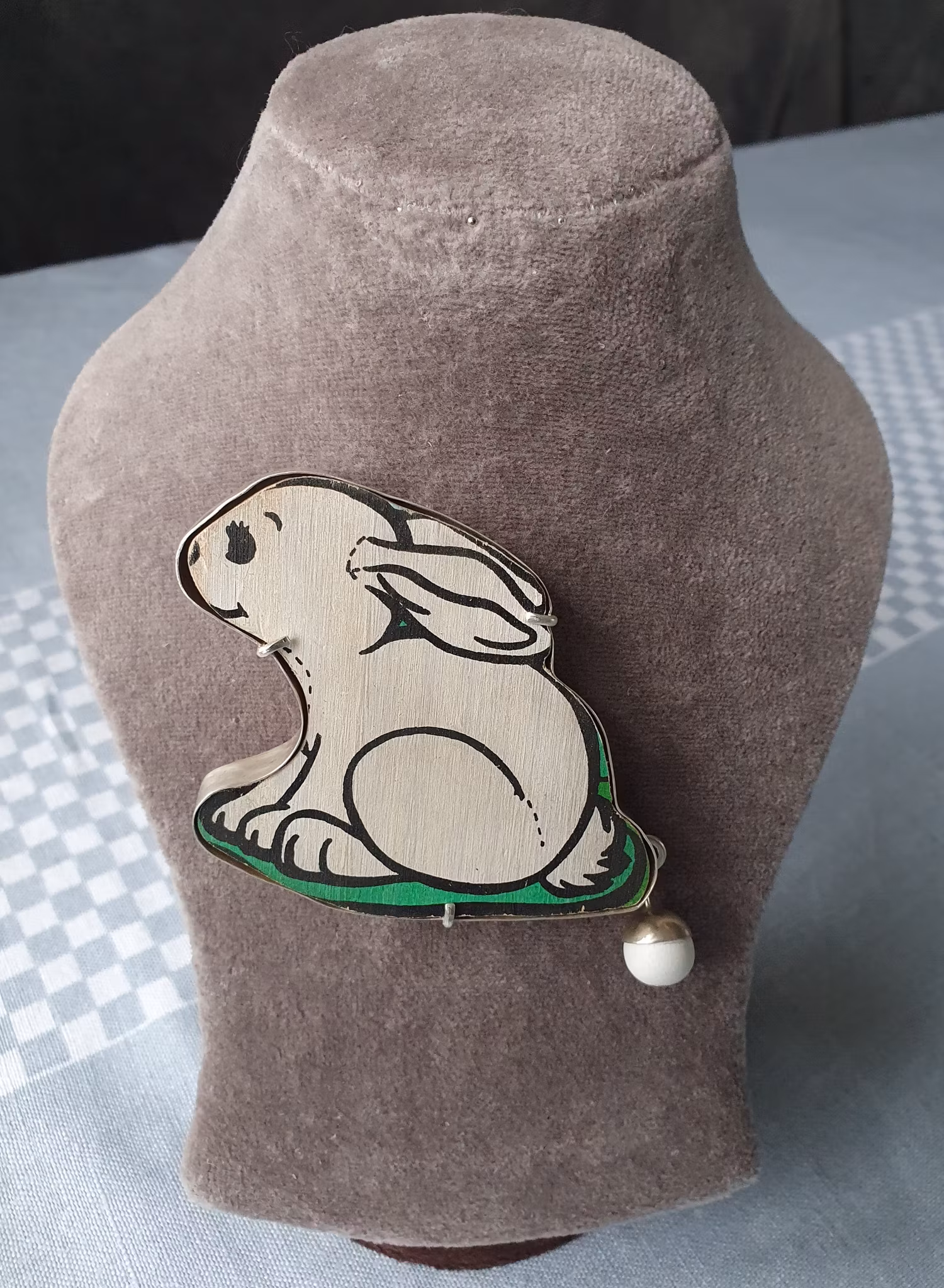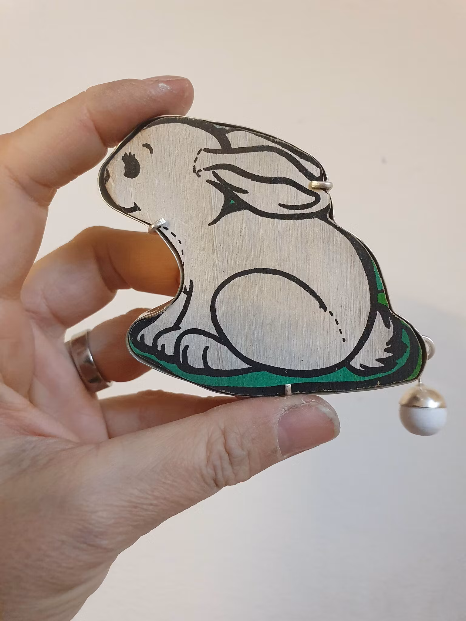 Kaninbrosch. Pusselbit i trä från babypussel. Infattad i sterlingsilver och med "pruttplutt" i trä och silver i rumpan. Broschnål av pianotråd.