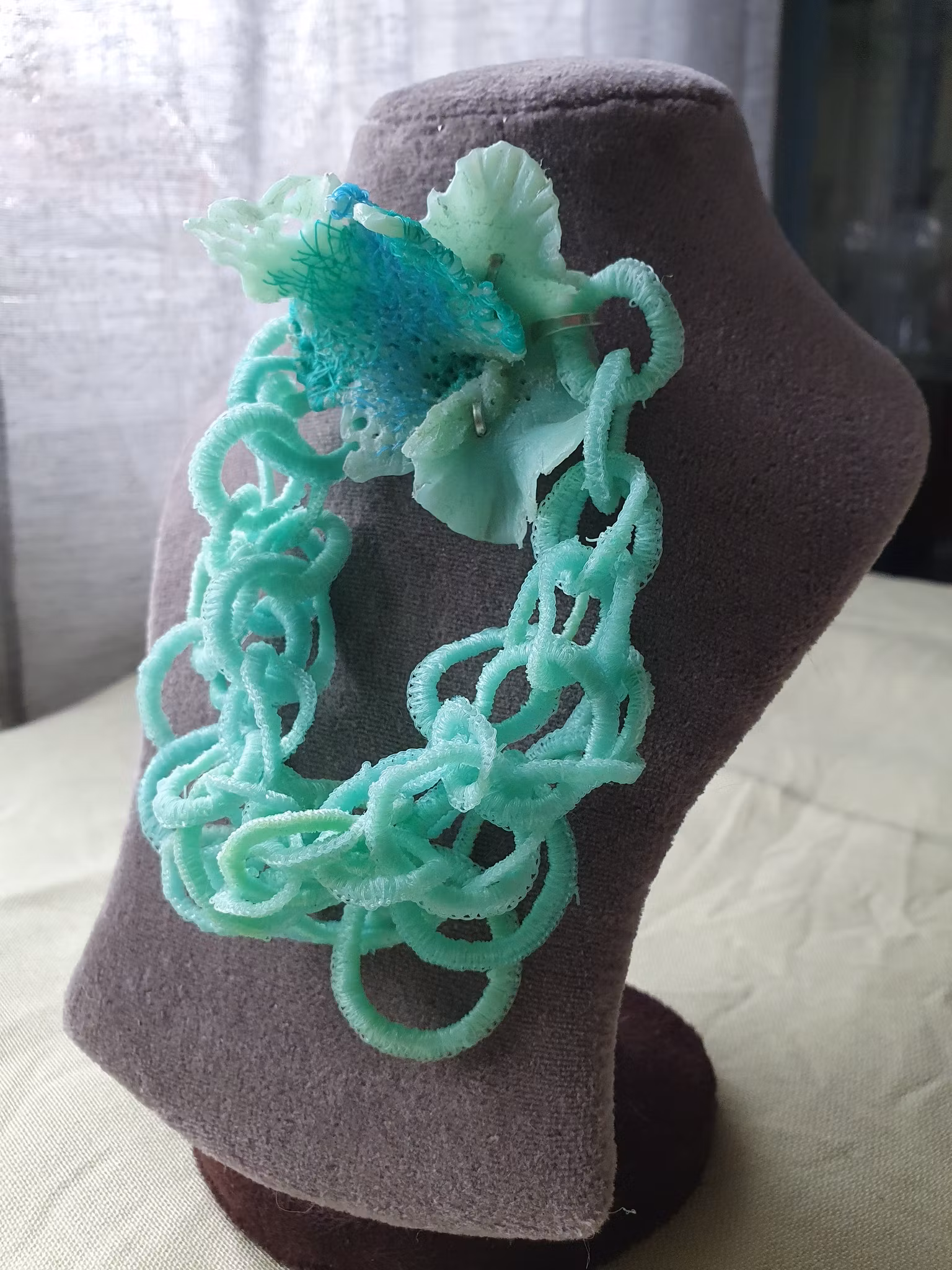 Statementbrosch. Smidd återbruksplast (del av simfot), broderad med spökgarn. Hängande kedja av virkat spökgarn. Baksida av sterlingsilver med nål av pianotråd.