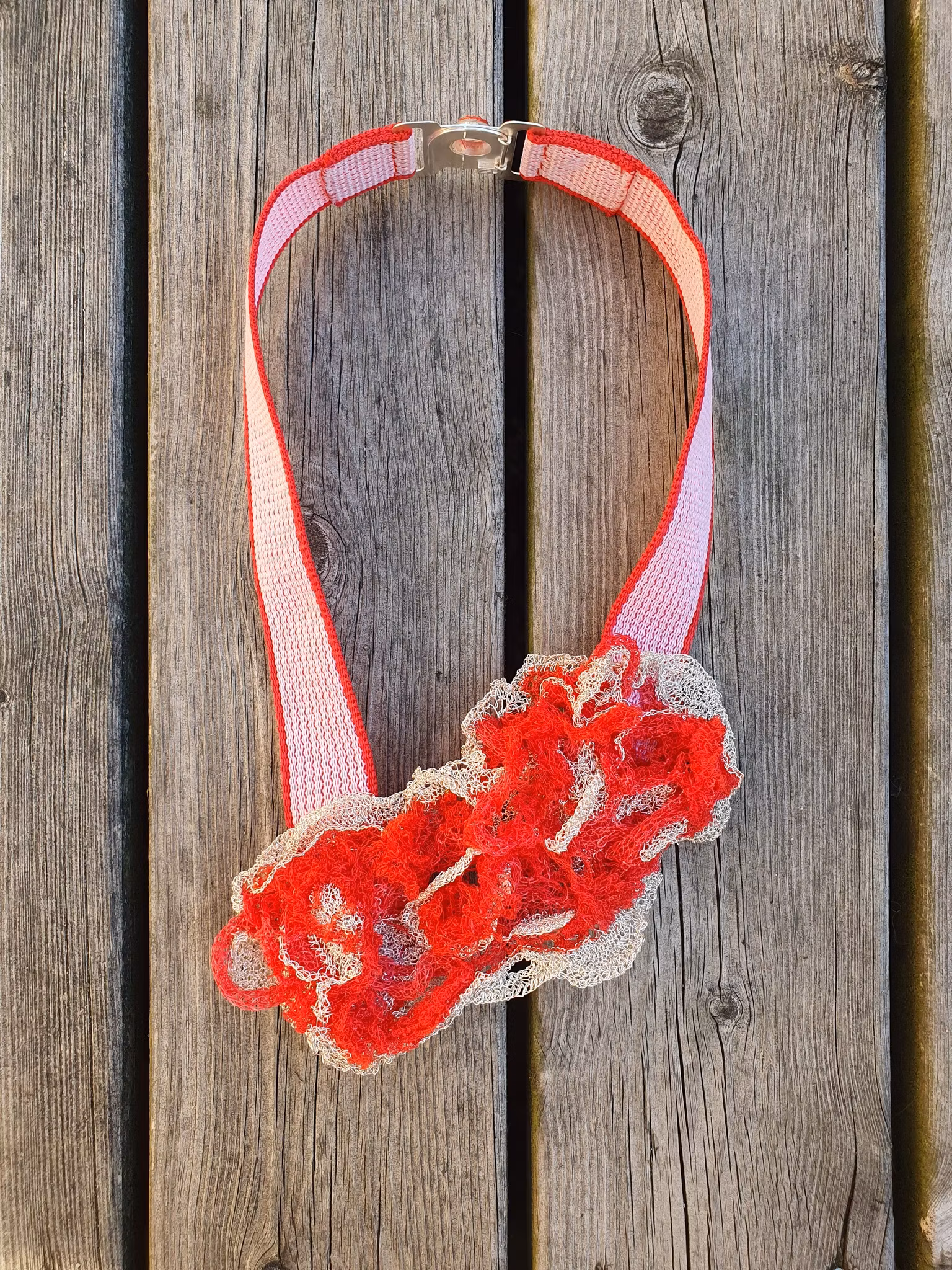 Stort asymmetriskt halsband. Virkat av gamla represter och finsilver. Band från loppisfyndad bandyklubbaväska. Lås i sterlingsilver. Längd i sin helhet ca 78 cm. Mått på enbart den virkade delen ca 20 x 10 cm.