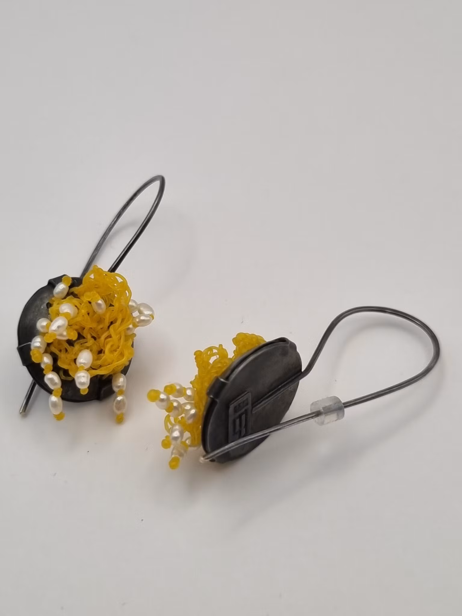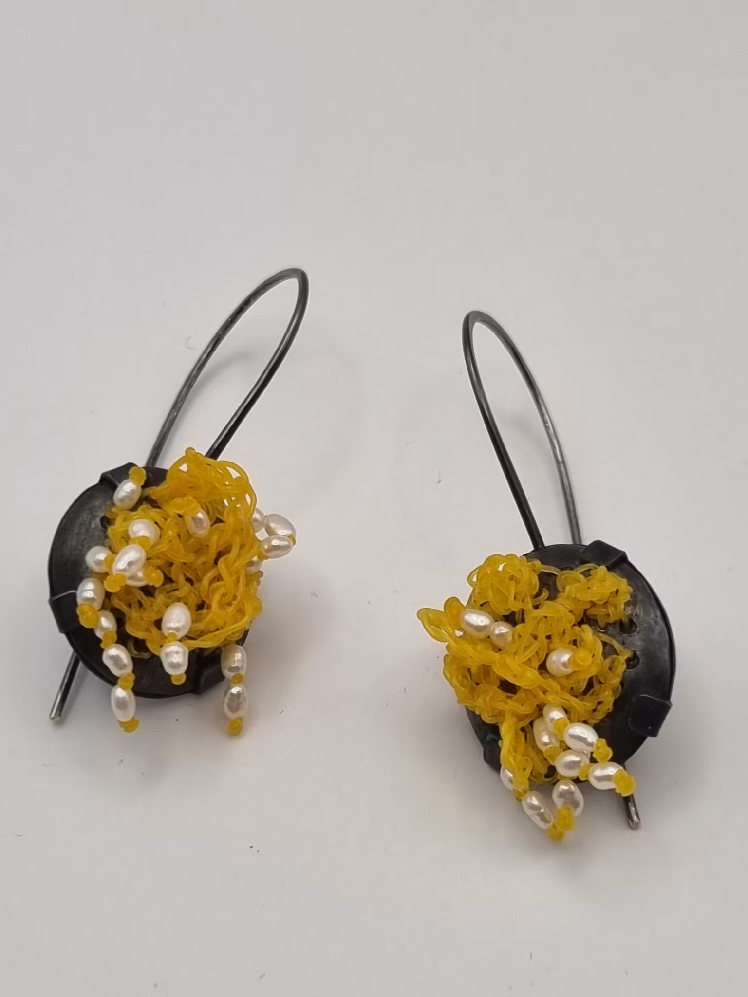 Örhängen i oxiderat sterlingsilver med virkat spökgarn och sötvattenpärlor. 2 400 kr Örhängen i oxiderat sterlingsilver (925/1000 silver) med virkat gult spökgarn och vita sötvattenpärlor. Längd ca: 4,5cm. Bredd ca: 1,6cm I lager. Lägg i korgen Dela Lagersaldo: 1 Artikelnummer: 60 Information Örhängen i oxiderat sterlingsilver (925/1000 silver) med virkat gult spökgarn och vita sötvattenpärlor. Längd ca: 4,5cm. Bredd ca: 1,6cm