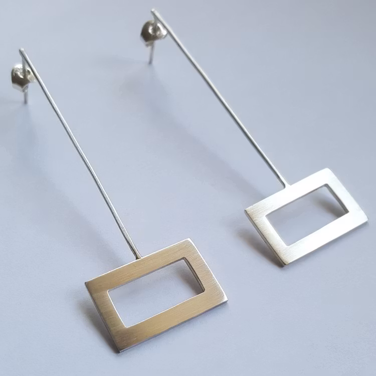 Handsågade rektanglar i silver på tunn silverstav. Sterlingsilver (925-1000 silver). Örstift av sterlingsilver. Längd: ca 6 cm. Kvadraten: ca 1,3 cm X 1,9 cm