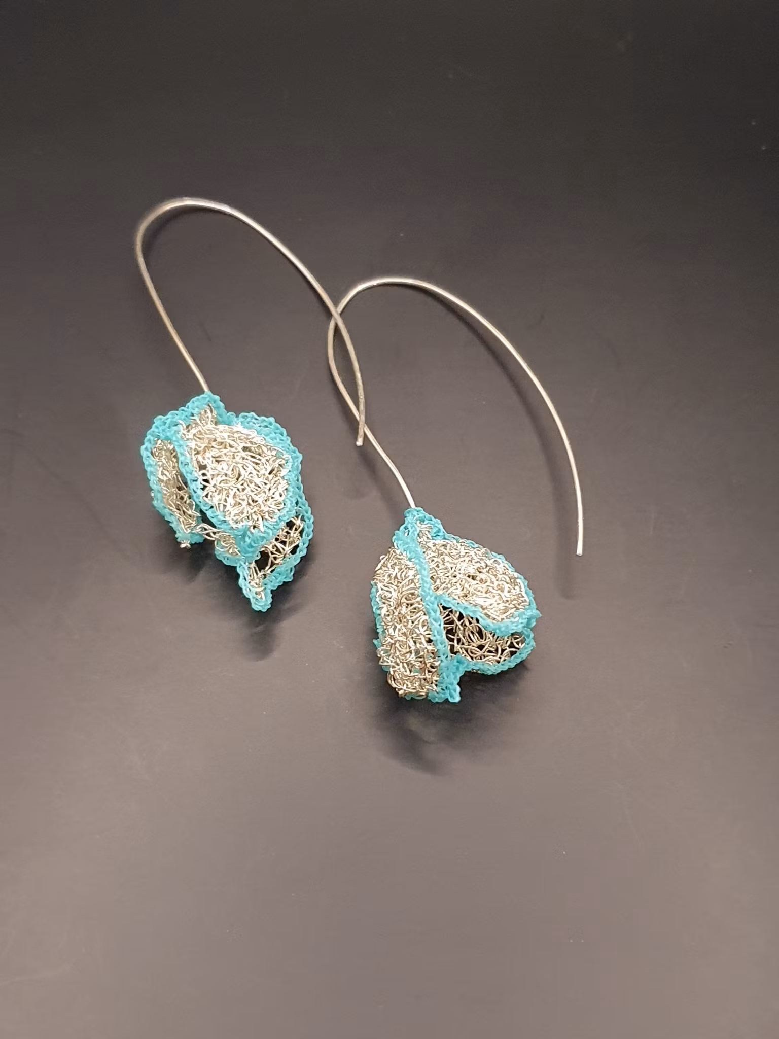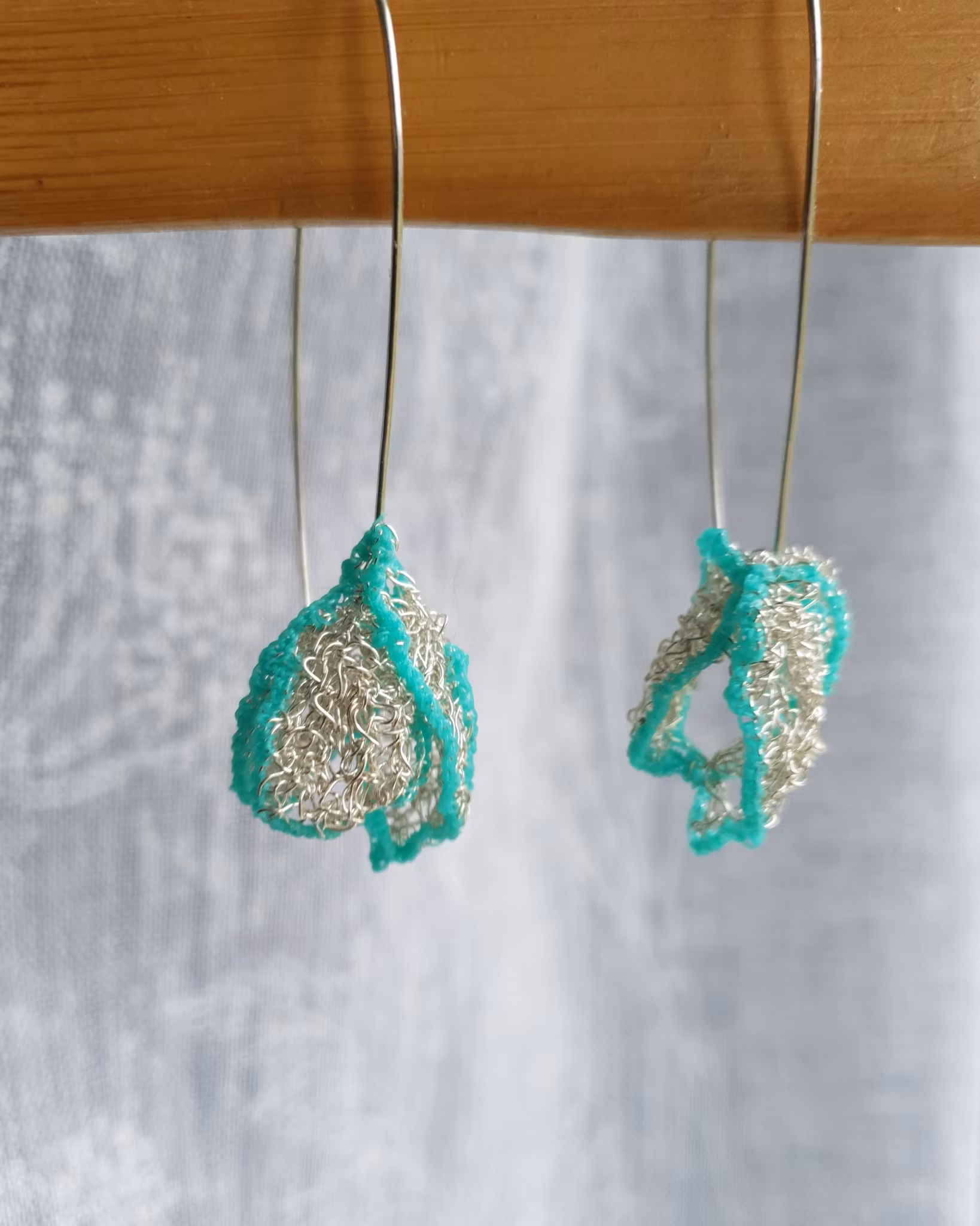 Hängande blomklockor av virkat finsilver (999/1000silver) och virkat turkosgrönt spökgarn. Örkrok av sterlingsilver (925/1000 silver).