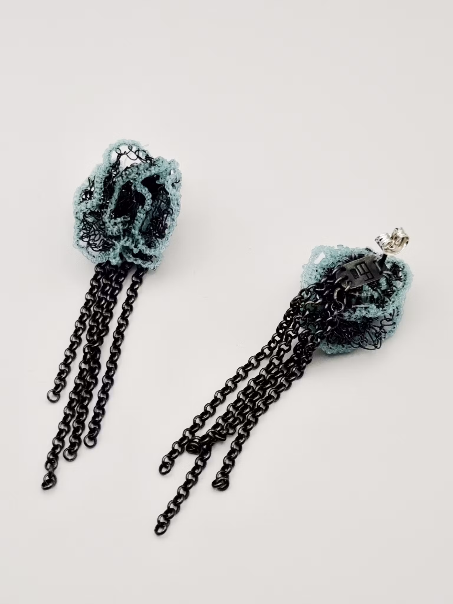 Örhängen av virkat oxiderat finsilver ( 999/1000 silver) och virkat mintgrönt spökgarn. Kedjor i oxiderat sterlingsilver (925/1000 silver). Baksida och örstift samt snurrebuss (låspluppen) i oxiderar sterlingsilver. Längd med kedjor ca: 8cm. Bredd ca: 2,5cm på bredaste stället.